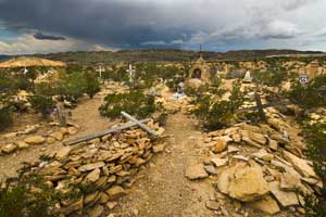 The cemetery shown in the photo in Terlingua’s ghost town rests about 400 souls, mainly from the early part of the 20th century when the mining town thrived for four decades. Aging wooden crosses and cone-shaped dirt and rock mounds called “relicaritos” mark the graves. The graves are predominately of middle-aged Hispanic men who died from the dangers of the area’s mercury mining. The cemetery is still in use.